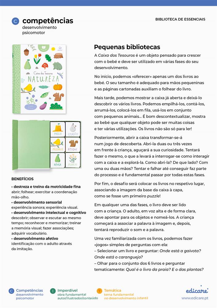 A destacar: Com 6 livros cartonados, ilustrados com cores fortes, ideais para estimular as primeiras descobertas do bebé e promover a sua relação com o livro enquanto objeto. / Caixa resistente com tampa magnética que funciona como um puzzle (o bebé coloca o livro na caixa por cima da imagem que lhe corresponde). / Cada livro explora um subtema de acordo com o tema da caixa: animais domésticos, do oceano, da savana, do jardim, da quinta e selvagens. / Formato pequeno e prático para transportar.